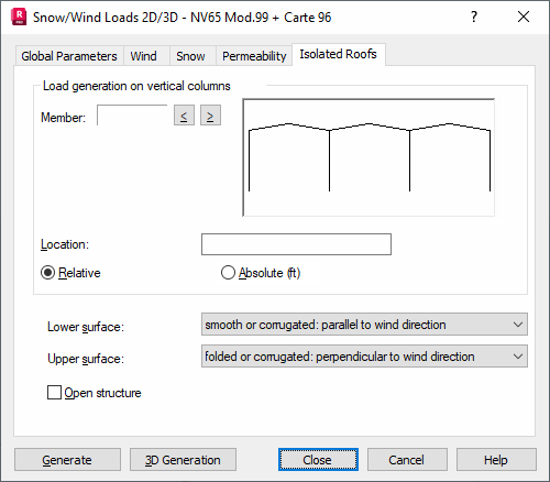 Opening the Snow/Wind Load dialog and clicking the Isolated Roofs tab displays the following dialog.