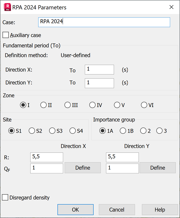 Parameters of a structure seismic analysis depend on a seismic code used during calculations of a structure influenced by seismic impact. Select Algerian seismic code RPA 2024 in the New Case Definition dialog or click Parameters in the Analysis Type dialog.