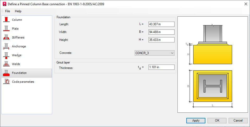 Use the Foundation tab to define basic parameters of the foundation; you can also select a concrete class for the foundation. This information is used to calculate the resistance of the column base plate for bearing pressure onto concrete. In the Grout layer field you can define parameters of a grout layer that is usually placed to correctly position the column and to ensure that the base plate is in complete contact with the foundation.