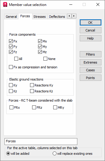 Select the Forces tab in the Member Value Selection dialog to select force components for presentation.