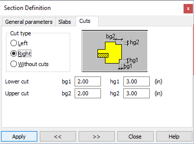 Cuts are located in the angles of the cross section. For each cut, the following dimensions are to be specified: width, height and the location: upper / lower.