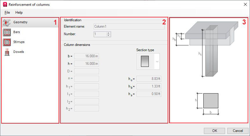 - In the center, you can define parameters of the column and reinforcement (depending on a selected component).