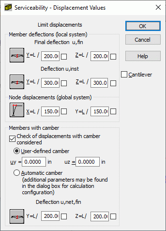 Limit displacements are defined as member deflection in the directions X and Y, resultant deflection yz, and node displacements in the directions X and Y. Additionally, while defining member limit deflections, you can determine if a member is a cantilever.