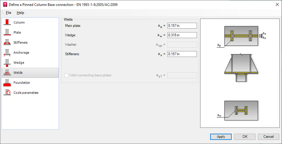 Use the Welds tab to define welds connecting individual elements of the column base (such as main plate, wedge, washer or stiffeners).