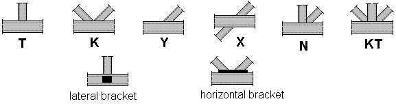 Connection calculations cover tube connection types K, N, KT, T, Y, and X. You can use I-sections as a chord in the connection, and can use brackets of the chord (horizontal plates, lateral plates) welded to the chord (as shown).