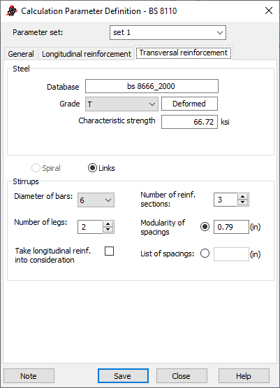 The Transversal reinforcement tab of the Definition of calculation parameters dialog box for BS Code: