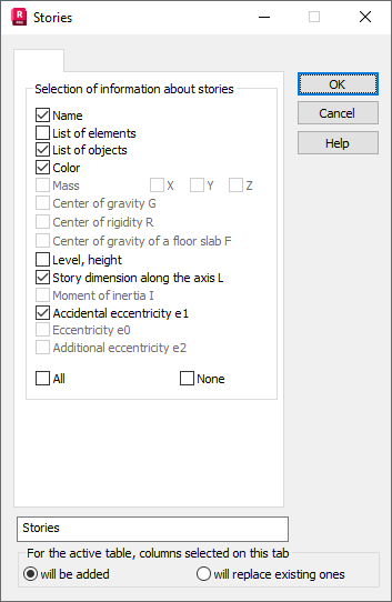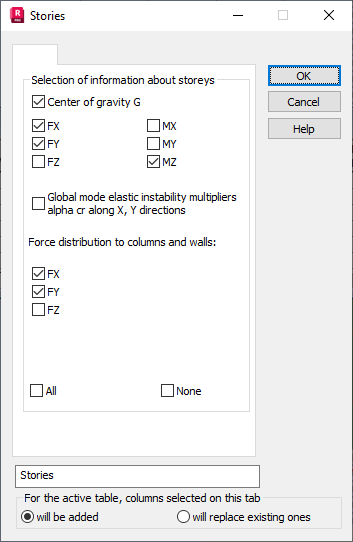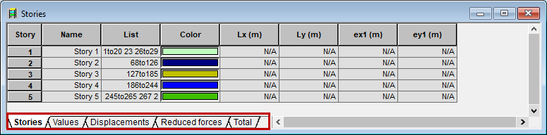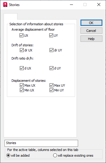 Note: The content of the Stories dialog depends on which tab is selected in the Stories table (Stories, Values, Displacements, Reduced forces, Total).