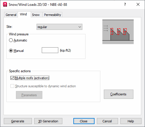 - Manual - Specifies basic wind pressure manually. When specifying values manually, Robot does not account for parameters such as Site.