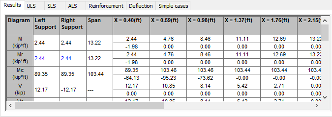 The tab is made up of a table in which the numeric values of the items selected for presentation may be chosen. The content of the table is related to the category of the results chosen from the scroll list found in the lower part of the dialog box as well as to the selection of the active span (in the case of a multi-span beam). The kind and extent of the displayed results depends also on the settings on the remaining tabs of the Diagrams dialog box.