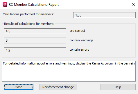The Calculations performed for bars field displays the numbers of RC members that underwent design. These members must be an RC beam or RC column. A theoretical (required) area of reinforcement in RC members can be determined only for them. Other element types that will be entered on the design element list in the Calculations dialog box are ignored automatically.