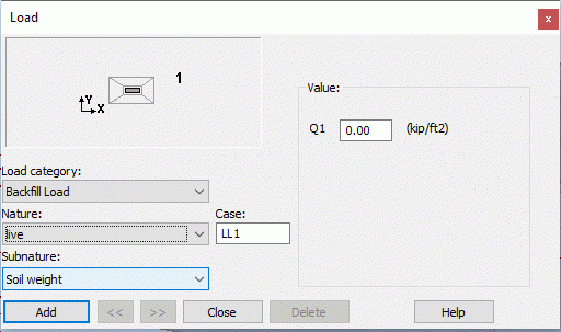 In the case of a backfill load, the value of the load Q1 should be entered. Two natures are available: dead and live.