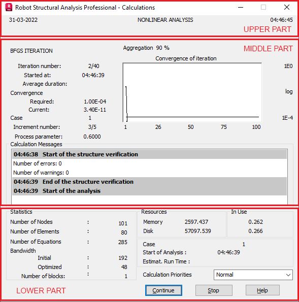- The middle section depends on the selected analysis type and a solver (chosen in the Job preferences dialog from the Structural Analysis tab). This section displays information regarding individual stages of structure calculations and indicates the current analysis stage.
