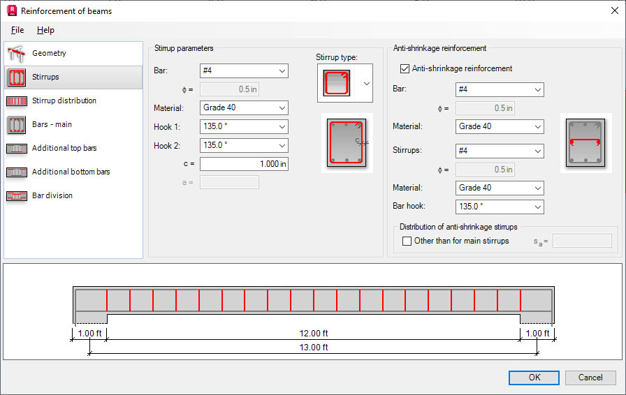 There are several parameters of transversal reinforcement (stirrups) defined in the Reinforcement of beams dialog: