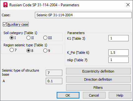 Parameters of a structure seismic analysis depend on a seismic code used during calculations of a structure influenced by seismic impact. Select Russian seismic code (SP 31-114 2004) in the New Case Definition dialog or click Parameters in the Analysis Type dialog.