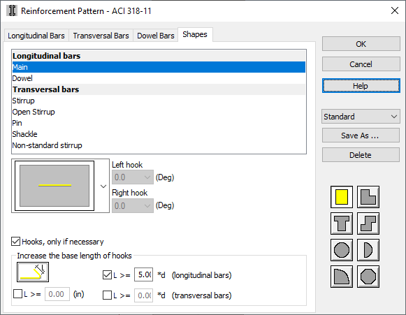 For longitudinal bars the shape selection can be made with regard to the bar type: main or dowel.