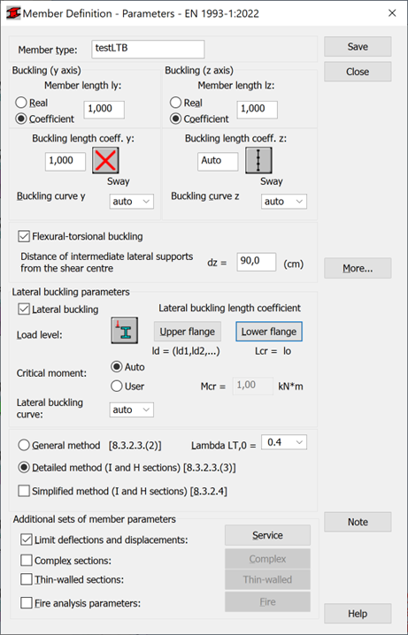 - Provides options used during verification of lateral buckling for the member: lateral buckling type, load level, critical moment, and lateral buckling length coefficient.