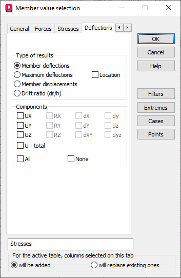 In the Components field you can select the following member displacement or deflection to be displayed.