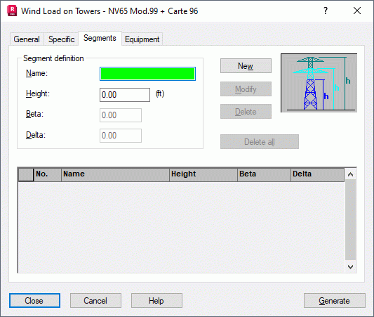 Opening the Wind loads on towers dialog and clicking the Segments tab displays the following dialog.