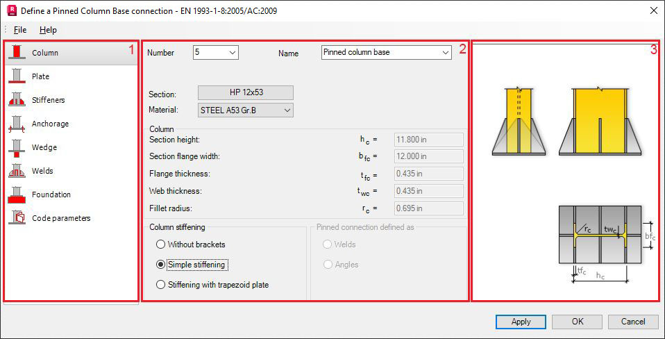 - In the center, you can define parameters of a selected element of the steel connection.