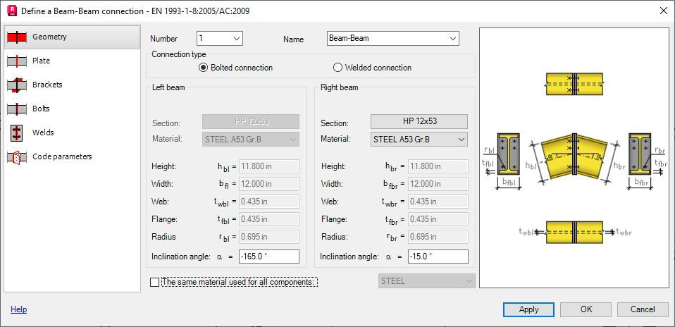Geometrical and material parameters of beams for which to create a connection, display in the center of the dialog.