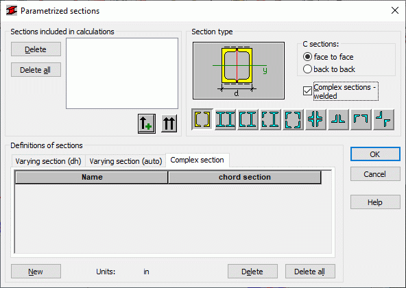 For some types of complex sections the Complex sections - welded option is available. If selected, then chords of a complex section are joined with welds along the section length.
