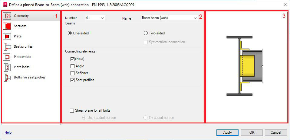 The dialog for generation of a principal beam-to-beam (web) or a principal beam-to-beam (flange) connection has 3 main parts: