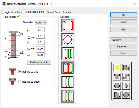 Recommended transversal reinforcement patterns in a section. The pattern list corresponds to the selected column section. According to selected patterns and their sequence, the program will accept the optimum solution.