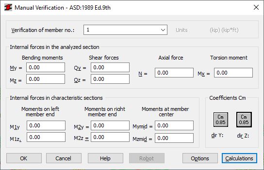 The Manual Verification dialog is used for manually verifying a steel member for values defined by the user according to the requirements of the American Steel Code ASD. Bar verifications are performed by assigning the force values appropriate for specific calculations. The dialog is divided into two main parts: