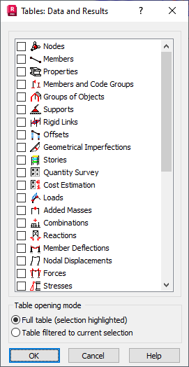 • Full table (selection highlighted) - When selected, the entire (full) table is opened. The rows that are assigned to the selected nodes, members, or objects are highlighted.