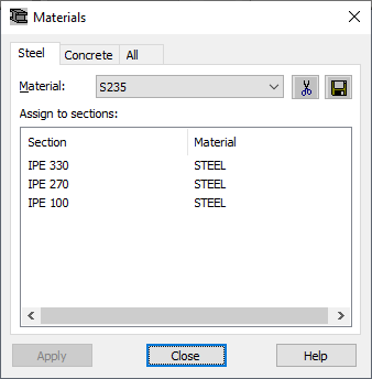 Use the Materials dialog to assign materials to sections selected from the list of active sections (the list under the Assign to sections option).