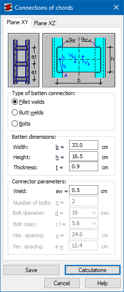 The geometrical verification of the distribution of bolts is performed in a batten connection. For the butt weld it is assumed that the weld length equals the batten height, while the thickness is a lesser value of the batten thickness and the thickness of flanges of the column chords.
