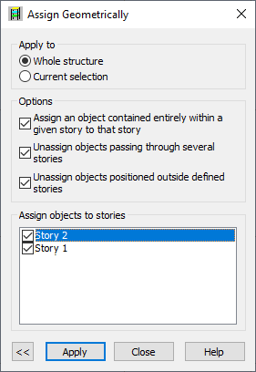 Use the option to assign elements of a structure to defined stories (important during verification of the structure). Access the option by selecting the Geometry > Stories > Assign Geometrically.