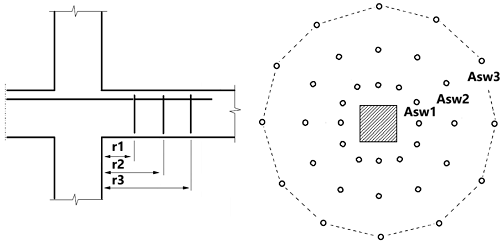 When vEd > vRd,c and vEd < vRd,max the shear reinforcement Asw is calculated based on equation (6.52). The outermost perimeter of shear reinforcement uout based on Eurocode requirements is calculated too. The assumption is that the maximum spacing of shear links in the tangential direction st equals 2*d. For each perimeter, reinforcement is the same except the situations where A sw,min equation (6.11) is important. In that case, r, u, and A sw are presented in the table in the dialog and the note.