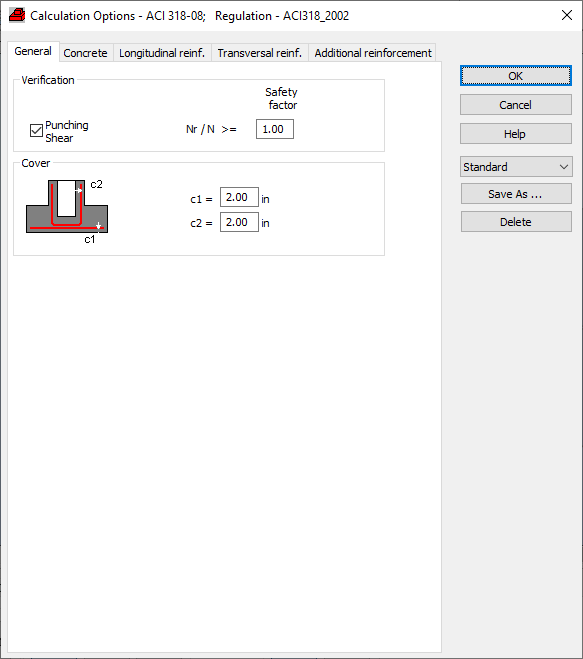 Once the Calculation Options dialog box for foundations is opened and the General tab is selected, the dialog box shown below will appear on the screen.