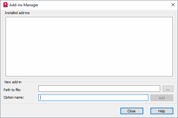 Click Add-ins > Add-ins Manager to open the Add-ins Manager dialog. This option lets you install and add add-ins (programs) to the appropriate places in the Robot menu.