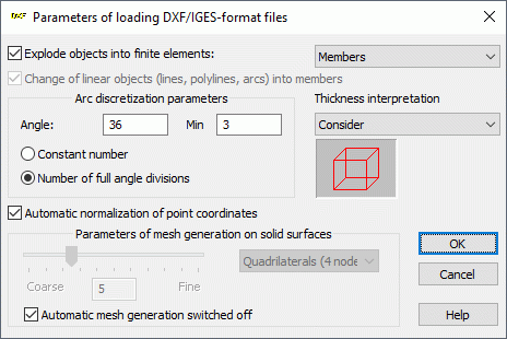 When this option is not selected, the elements defined in the DXF file are treated as objects: lines, arcs, contours, and so on. Turning the option off is only recommended for plate or shell structures.