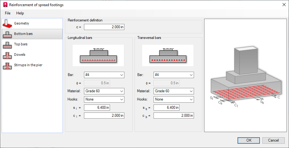 There are several parameters of bottom reinforcement defined in the Reinforcement of spread footing dialog: