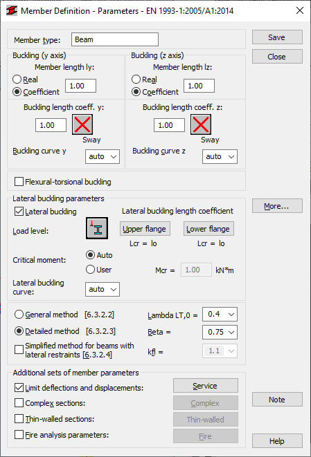 - Provides options used during verification of lateral buckling for the member: lateral buckling type, load level, critical moment, and lateral buckling length coefficient.