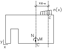 When using the BAEL classic method or selecting the ACI code, and also in the shear and sliding calculations according to the BAEL simplified method, linear loads applied on any level of the wall are transformed to the N-M system of reduced loads in the section through the wall base. Loads are reduced as shown in the following drawing.