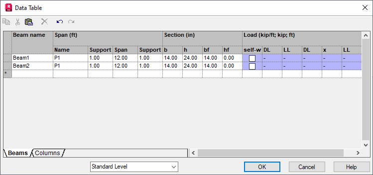 The Data table offers a quick means of defining any number of beam or column elements, accompanied by loads, to be followed by calculations. The dialog is divided into two tabs: Beams and Columns.