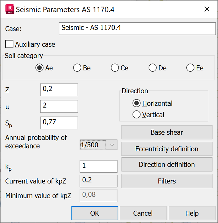 To perform the seismic analysis according to the rules given in the AS 1170.4:2007 code, define the following parameters: