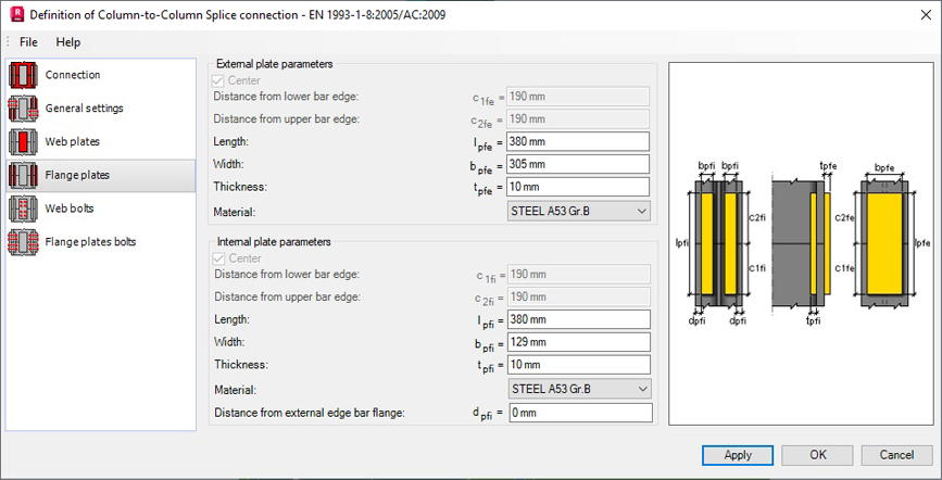 Note: If the connection is not symmetrical the Flange plates panel is divided in two panels: