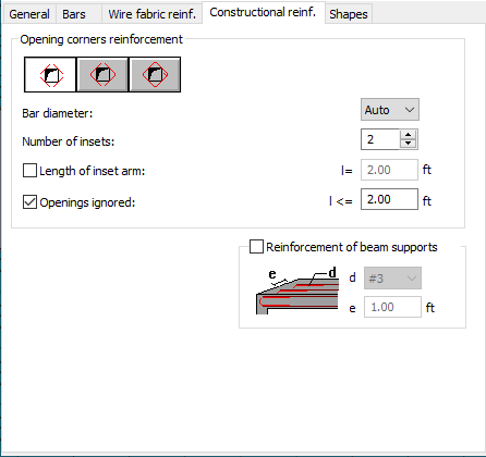Opening corners reinforcement selects the distribution method for reinforcement of slab openings. The diameter of reinforcing bars and numbers of insets may be selected there.