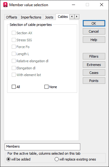 Select the Cables tab in the Columns dialog to select cable parameters for presentation.