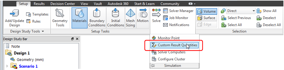 Click Setup > Simulation > Custom Result Quantities to open the dialog.