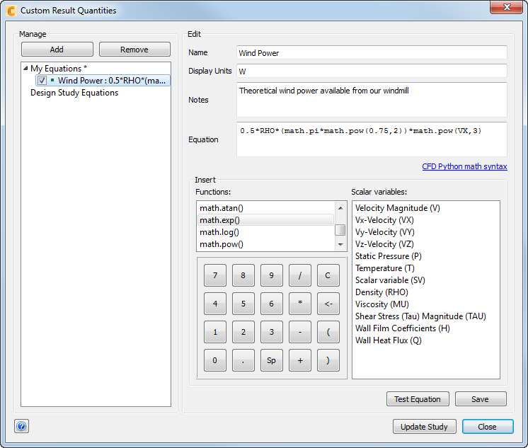 Click Test Equation to open a dialog in which you can verify and modify your equation. If you do modify your equation, click Update Equation to pass the new equation back to the Custom Result Quantities dialog.