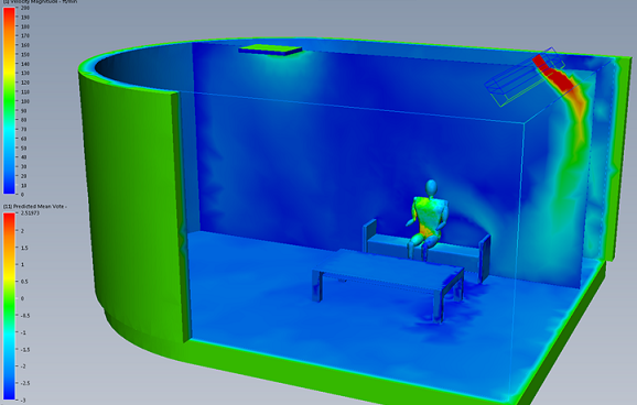 In the image, velocity is plotted on the results plane, and PMV is plotted on the surfaces:
