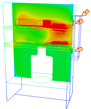 The air at the heat exchanger inlet (B) is clearly warmer than the outlet air (C). The temperature drop indicates that this heat exchanger has removed heat from the working fluid.