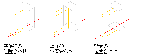 面材を、組合せ窓の基準線を中心に、基準線の正面に、または基準線の背面に位置合わせするには、次の手順を実行します。プラン ビューでは、組合せ窓(左から右に描いた場合)の正面とは基準線の下側で、背面とは基準線の上側です。