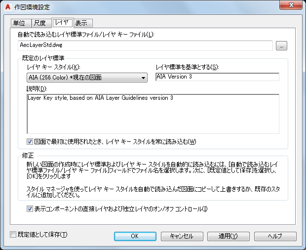 [作図環境設定]ダイアログ ボックスのレイヤ設定。レイヤ キー スタイルは自動読み込みに設定され、[既定値として保存]がオンになることに注意してください。これにより、テンプレートなしで図面を開始した場合でも、確実に正しいレイヤ キー スタイルが読み込まれます。[図面で最初に使用されたとき、レイヤ キー スタイルを常に読み込む]がオンになっていることにも注意してください。これは図面ベースの設定で、テンプレートに設定する必要があります。これにより、最新のレイヤ キー スタイルが、すでに進行中の図面でも使用されます。